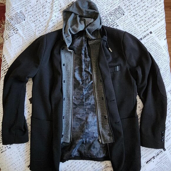 Casual blazer with camo print inside + buttoned up hoodie. Very good condition and no huge signs of wear.