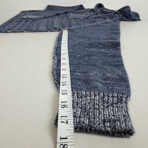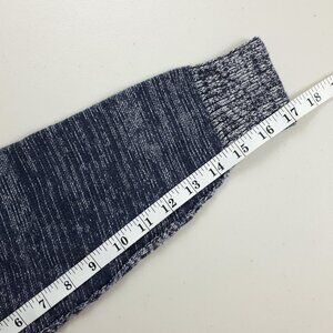 A cozy knit hoodie in a striped heather blue shade. Made from cotton to keep you warm and toasty. It’s v-neck style with a quarter zip closure and a drawstring tie. Designed with raised seams at the sleeves to give it a unique look. The rib knit hem and cuffs give it a snug and comfortable fit. Perfect for fall and winter. Great condition.