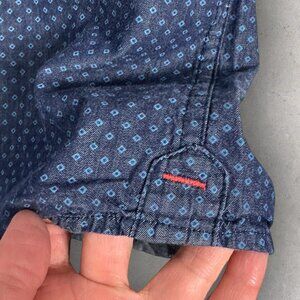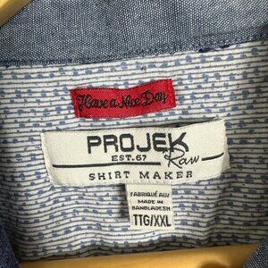 Projek Raw Blue Printed Short Sleeve Collared Shirt in Men's Size XXL. Chest pockets with flap button closure. Pointed collar. Short sleeves. Made in Bangladesh. # 132245. 100% cotton. Machine washable.