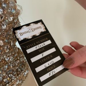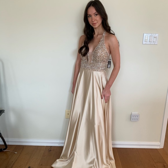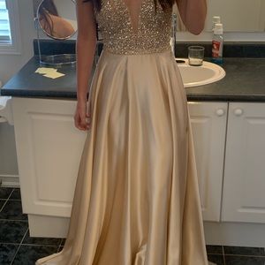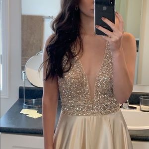 Gorgeous gold/champagne satin dress with sparkly beading at the top. It is backless and has a halter top style. TAGS ARE STILL ON, NEVER BEEN WORN. Brand new condition and I bought it for $680 at Bridal Desires. Listing it at almost 60% off! Size 8, fits a small/medium best. Pick up on porch