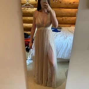 Champagne Tulle plunge V neck prom dress. I wore it once for my prom, never used it again. beautiful beautiful dress, great for prom or dance or fancy occasion!