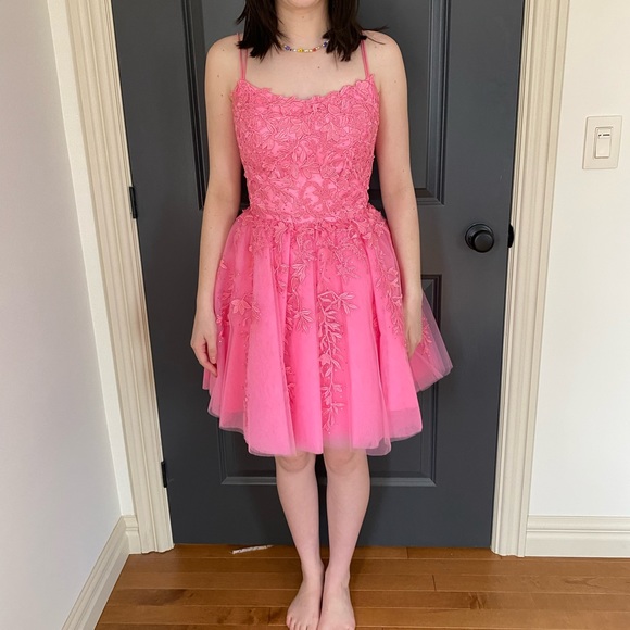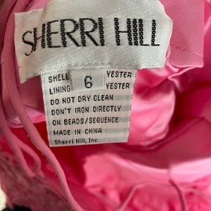 Sherri Hill size 6 beautiful cocktail dress was worn only once for grade 9 graduation dance. Model is 5’7” . Dress is size 6 beautiful pink colour and lace detail.
