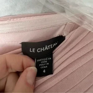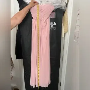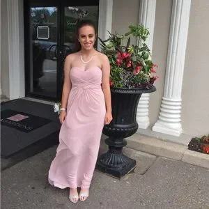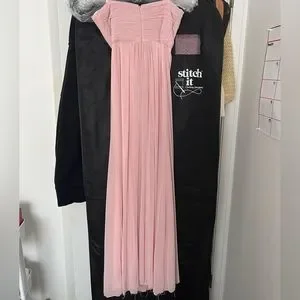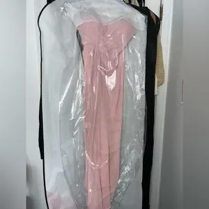 Light/baby pink prom dress size 4 I used once when graduating grade 12. This dress has some fraying on the bottom (see photos) from stepping on it but could be repaired easily by hemming. This dress has been kept in plastic covering but would probably benefit from dry clean.