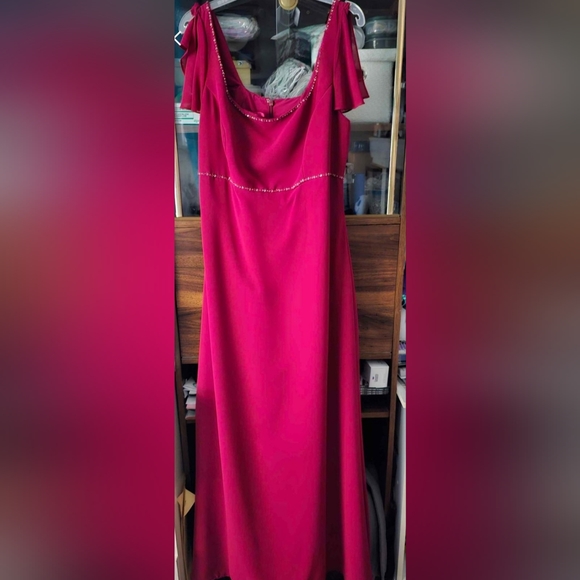 My prom dress that I got from Hannamar's Bridal shop. Polyester and it's dry clean only. It's a size 20.
