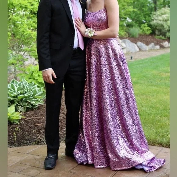 Worn once. Full length lilac/pink sequin gown with pockets. Size 4. Front hemmed to fit height of 5ft 7in wearing flat shoes.
