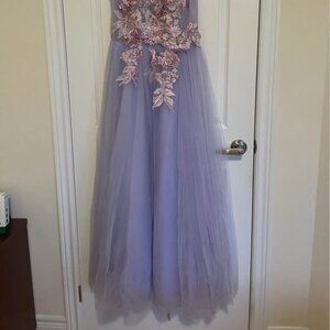 Floor-length gown with floral embellishments. Features a lace-up back that is adjustable to your size. It's a perfect dress for a special occasion.
