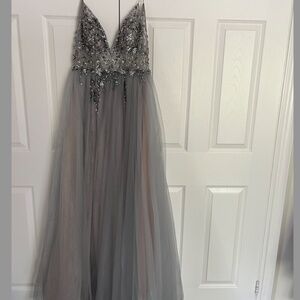 Violet Grey Tulle Crystal Beaded Prom Dress