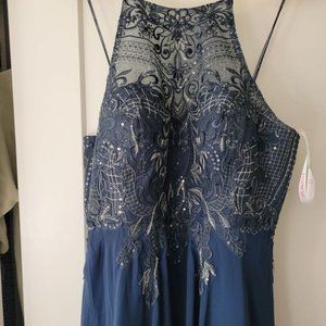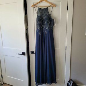 This is a beautiful Navy Blue Prom Dress from JJ House. Never been worn, only tired on briefly!! It is a size 16 but check out the size chart for measurements. You can see the dress on line at https://www.jjshouse.com/A-Line-Scoop-Neck-Floor-Length-Chiffon-Prom-Dresses-With-Lace-Sequins-018220247-g220247?filterColor=dark_navy