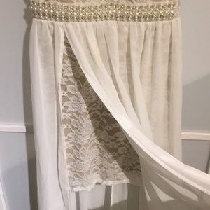 GORGEOUS nude and white prom or grad dress. Lace and pearl detailing. Tight dress with a deep V (has boning to hold) and a white overlay with a slit. So comfortable! Only worn once.