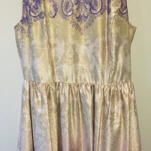 Very good preowned condition, satiny, champagne cream/with a hint of peach, sleeveless, a-line dress by Joe Fresh featuring a bold and expressive rococo/modern fusion damask pattern in beige, black, purple and pink. This is just so darn pretty and beautifully constructed with a flattering fit.