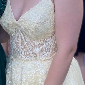 Beautiful buttercup yellow Collette prom dress. Worn once for grad 22 and dry cleaned recently. It’s in excellent shape. The dress has been hemmed for a height of 5’2. Bought new for $695 from Victoria Prom dress store. Lots of beautiful detail and very elegant.