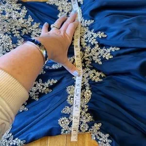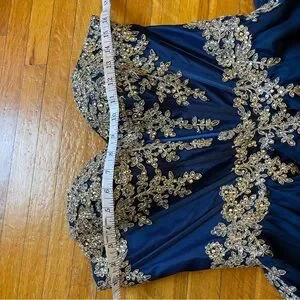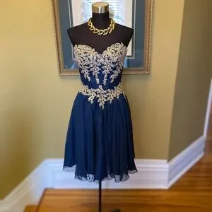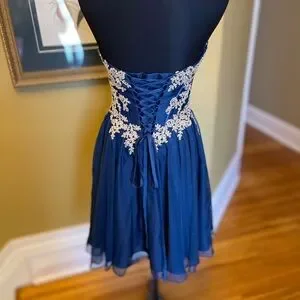 Mini prom dress shown fitting beautifully on a size 6 mannequin whose measurements are bust 34” waist 28”. The photos with the measuring tape are with the back in a relaxed, neutral position- neither laced tight nor loose. Perfect for sizes 4-8. Length from armpit to hem about 26”. Final clearance price.
