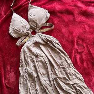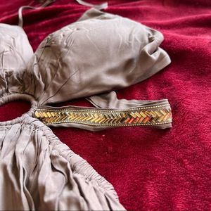 Has a leg slips and you can tie it in back for adjusting to your liking
