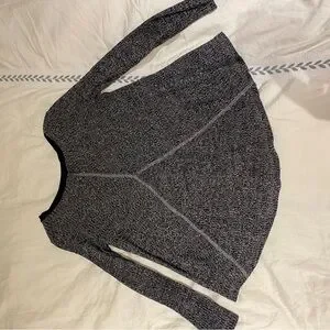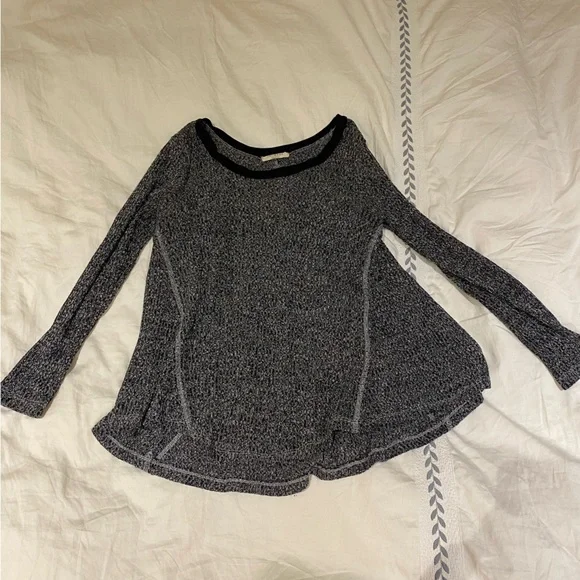 Salt and pepper coloured top with black lining along collar. Very flowy a-line style. Stretchy and fits small.