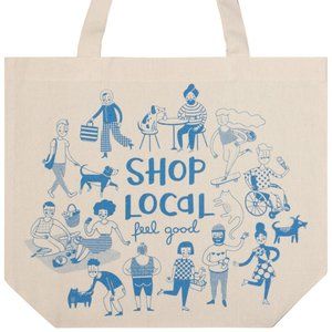 Generous cotton tote bags pack a lot of personality and more. Treasures from the farmer’s market, library, or store fit with ease. The reinforced stitching and flat bottom allow for easy packing, and long handles make carrying a breeze. Celebrate community and show love for our local businesses with this charismatic collection.