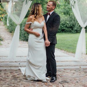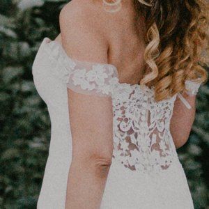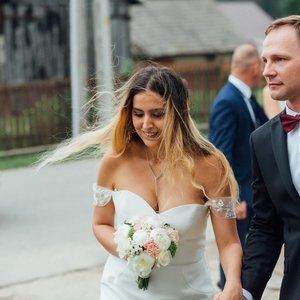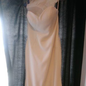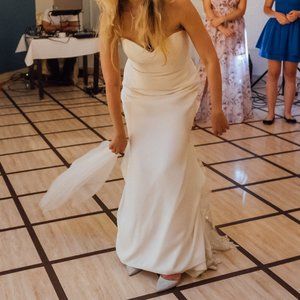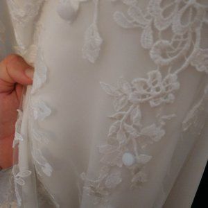 It's a beautiful wedding dress from Pronovias Barcelona. Size 12 (the seamstress tucked in some inches). White color, with lace back and long train (you can see details in the pictures). The seamstress added some alterations in the train (you can see bottoms in the pictures), for me to be able to pick it up and dance during party, and it worked perfectly. The little sleeves can be removed (maybe you'll want to reinforce it, because some times they detach from one side with movement). The dress doesn't feel heavy. It has a nice clivage (I don't have big breast, so I used push up bra to enhance it).