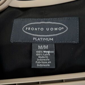 This Pronto Uomo vest in black is a timeless addition to any formal wardrobe. Crafted from high-quality suiting material, it features a classic V-neck cut and a fitted silhouette, perfect for completing a sophisticated look. Ideal for formal occasions, this vest embodies elegance and style. Great condition pit to pit is 20 1/2 inches top to bottom is 25 inches and shoulder width is 13 5/8 inches