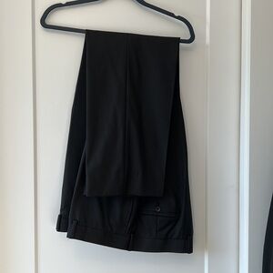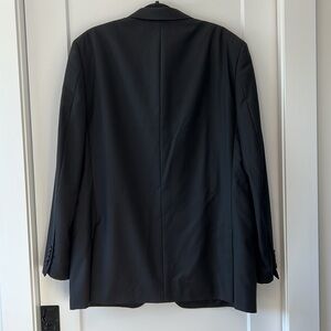 From Moores. In excellent condition. Black suit with a dark blue and grey pinstripe. Pants are 44 long, 39 waist.