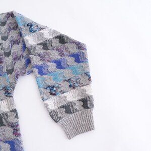 This Vintage Pronto-Uomo Gray and Blue Houndstooth Knit Crew Neck Sweater in size Large is a true Italian-crafted masterpiece, combining fine knit quality with a classic, eclectic "grandpa" style. Made in Italy, this sweater boasts a unique houndstooth pattern in a blend of gray and blue tones, offering both timeless sophistication and a cozy aesthetic. Its fine-knit texture provides a soft, comfortable fit, perfect for chilly days or layering with a coat.