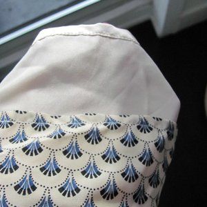 Propaganda skirt, small pockets, cream-coloured fabric w/blue design. Elastic waistband, zip-up back. Decorative drawstring at front w/metal bell-shaped drawstring ends. Longer at the back than at the front. Light gold-coloured lining.