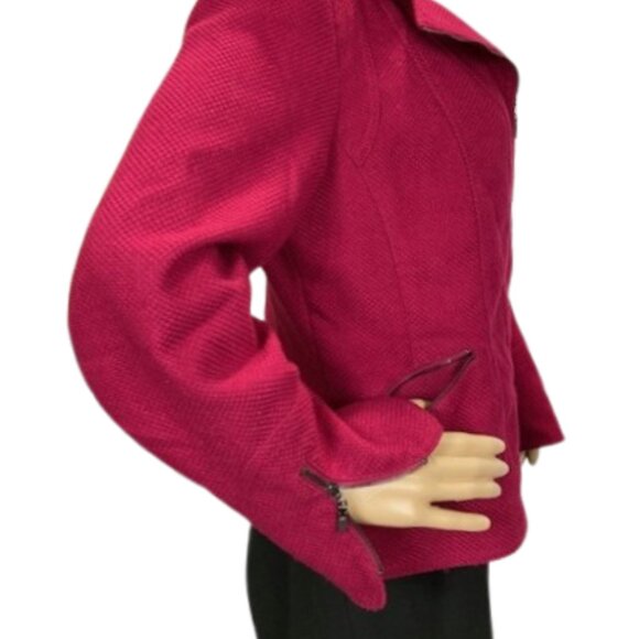 Make a bold statement with this vibrant fuchsia blazer jacket, perfect for adding a pop of color to your wardrobe. Crafted from a rich, textured fabric, this fully lined blazer features a sharp notched collar, sleek zippered front closure, and coordinating zippered sleeves for a contemporary edge. Functional zippered front pockets offer both utility and style, while the straight hemline ensures a clean, structured silhouette that flatters a variety of body types. Layer it over a crisp white blouse and tailored trousers for a standout office look, or pair it with high-rise jeans and ankle boots for a stylish off-duty ensemble. For added edge, wear it with black leather pants and a fitted tank.