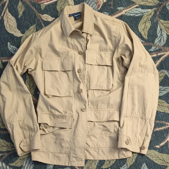 Durable tan field jacket with multiple pockets. Ideal for outdoor activities. Classic military style.