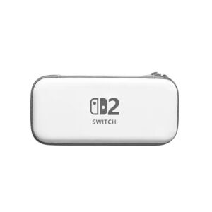 Third-party EVA hard shell carrying case compatible with Nintendo Switch 2. Zipper closure, shockproof, water-resistant. Fits console, cables, games. Available in blue, white, black, silver.