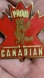 Red maple leaf pin with beaver in center, gold accents and 'Proud Canadian' text.