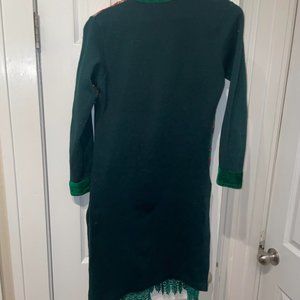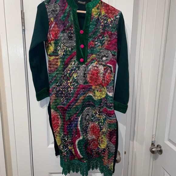 bright pink and green tunic, size M, Komal collection, side split, velvet and lace detailing, textured, artistic