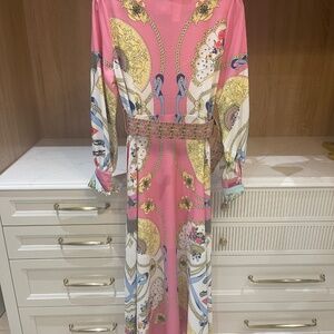 Beautiful print unique dress 55” long, belted, lined and has 2 side pockets Tag in U S Dollars