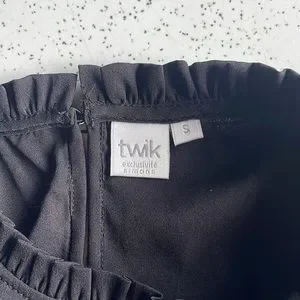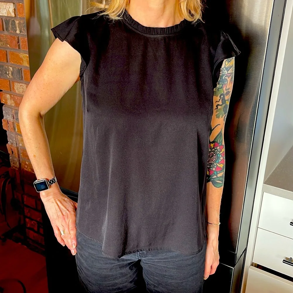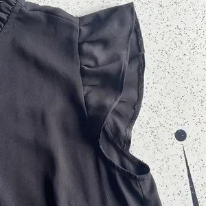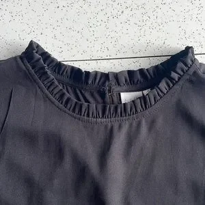 Light loose Black blouse with cute ruffle neck detail and puff sleeves. By Twik