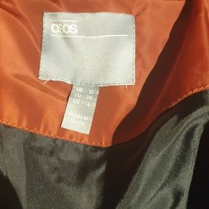 rust red down puffer with 3 pockets, 2 on the side and one on the chest.