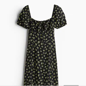 Puff-sleeved Midi Dress with a slit, Black/floral, S (feels like XS), H&M
