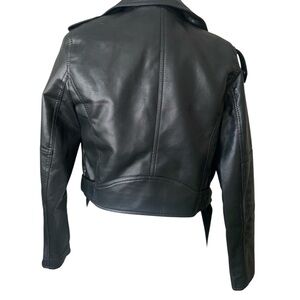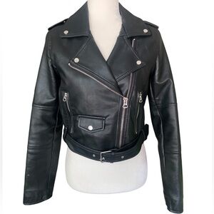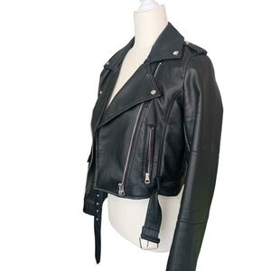 Tags Chic black faux leather biker jacket perfect for edgy and modern looks. Features silver zippers, functional pockets, and an adjustable waist belt. A versatile layering piece ideal for street style, night-out outfits, or adding a cool-girl touch to any ensemble. Minimal and sleek with classic black and silver details, it fits effortlessly into a capsule wardrobe. Great for fall fashion, transitional weather, or statement styling. Vintage-inspired with a modern twist, ideal for those who love bold, stylish outerwear.