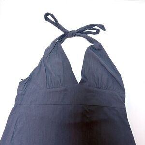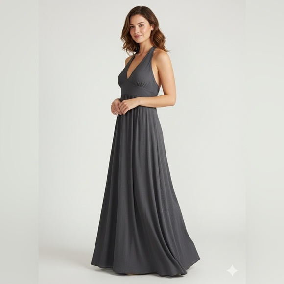 Chic charcoal maxi dress with halter neckline. Flowy and stylish for any event.