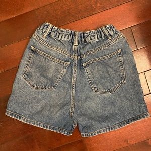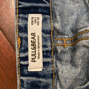 Pull&Bear high-waisted blue jean shorts. Size is euro 36, US 4, waist is 28 inches. Model is 5'8". Easy to fold them shorter too, denim is flexible.