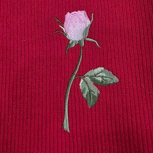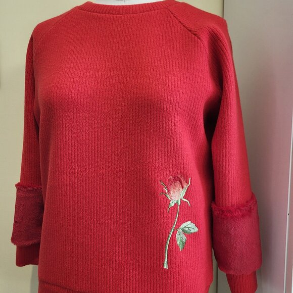 Pullover is made from fabric with 40% wool and cotton, machined embroidery rose, fur insert on the sleeves