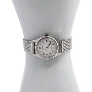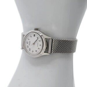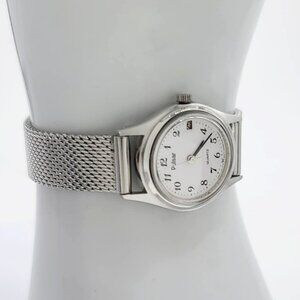 Refurbished with brand new crystal and stainless steel band (band can be changed free of charge, to any in-stock leather, mesh, metal, nylon or rubber band-message me with preference), Pulsar model 463880 featuring 1-Jewel quartz analog movement with brand new battery and date display in excellent working condition. Clean classic white and silver with black hands and markers and silver second hand. Case 22mm Band 12mm. Current band measures 8" adjustable down.
