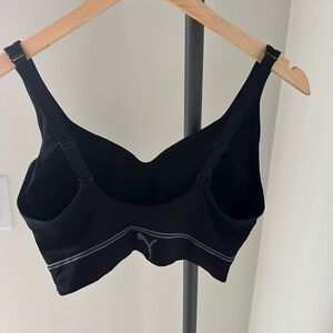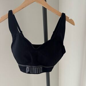 Experience ultimate comfort and support with this Puma sports bra, designed in a sleek black hue. Featuring wide shoulder straps and a stylish sweetheart neckline, it offers both functionality and a flattering fit. The iconic Puma logo on the bottom band adds a touch of sporty elegance to this essential piece of activewear.