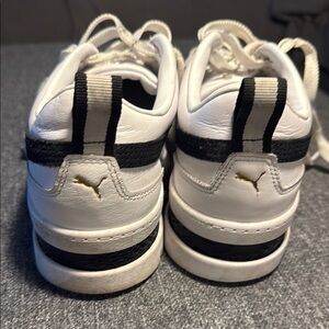 Sleek Puma sneakers in white with bold black stripes. Ideal for everyday style.