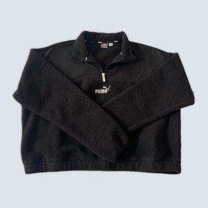 Puma fleece half-zip sweatshirt in black. A cropped style but long enough to cover, for athletic wear or to add to your daily outfit.