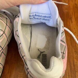 Early 2000s/Y2K Puma Future Cat Low White and Pink Plaid Leather Runners - fits large. Well worn but lots of life left.