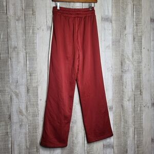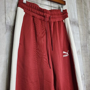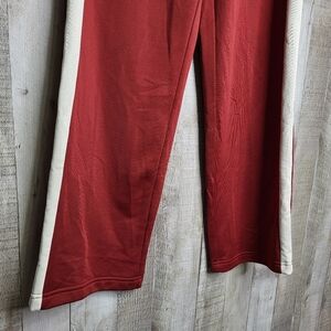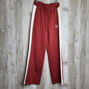 Stylish red track pants with white side stripes. Features Puma logo. Color is a rusty red and off white.