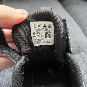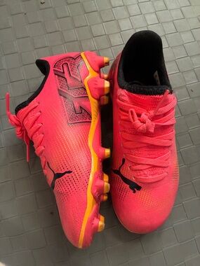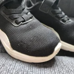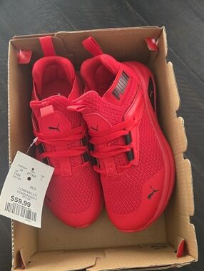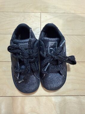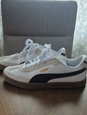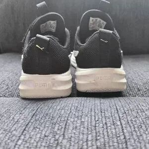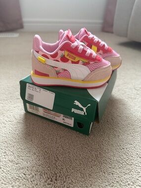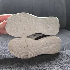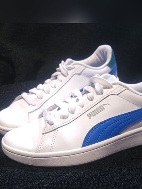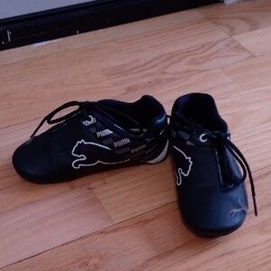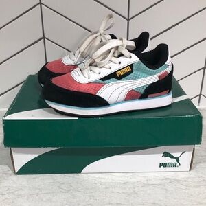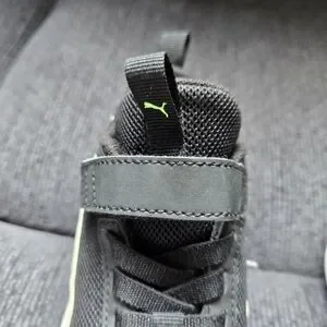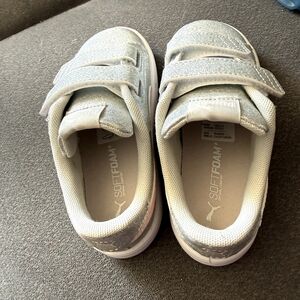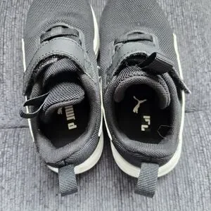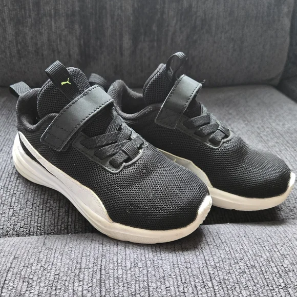 puma kids velcro runnings shoes in littles kids size 10 one tab above the velcro in missing the green puma symbol. loose thread on white side part on each shoe shown in photos. very good used condition overall.