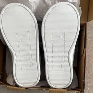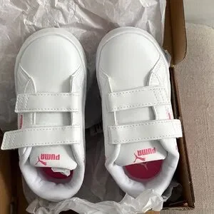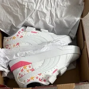 Fun and sporty Puma sneakers. White base with pink and orange star accents. Ideal for active kids.