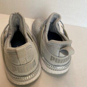These Puma sneakers feature a sleek, all-white design with a breathable knit upper and a seamless, lightweight construction. The sock-like collar ensures a snug fit, making them perfect for both athletic and casual wear.