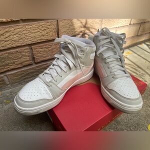 Stylish Puma Rebound V6 Mid Jr sneakers in a clean white, soft pink, and gray colorway. Classic mid-top design inspired by basketball sneakers.