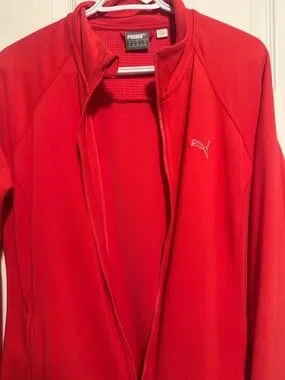 Lightweight athletic jacket with full front zipper. Embroidered Puma logo on chest. Two zippered front pockets. Clean sporty silhouette for training or everyday wear. this is a beautiful sports little jacket. The pit pit is 21 inches and there’s stretch. It’s very soft.