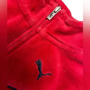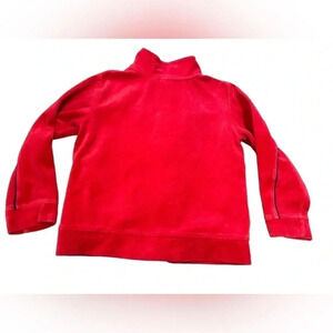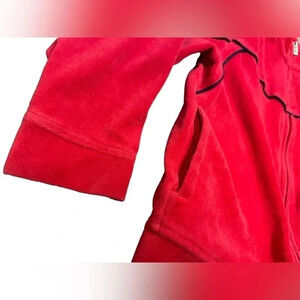A red velvety material with dark blue stripe up each arm as well as the logo.