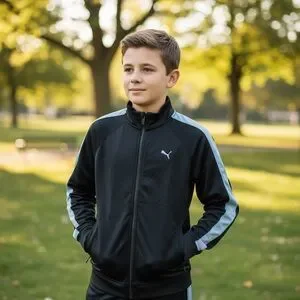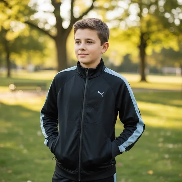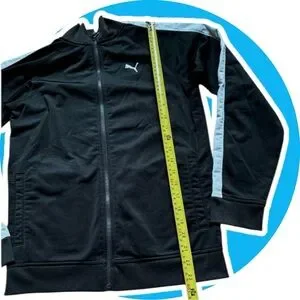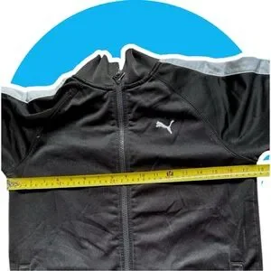 Sleek black jacket with white stripes. Puma logo on chest.